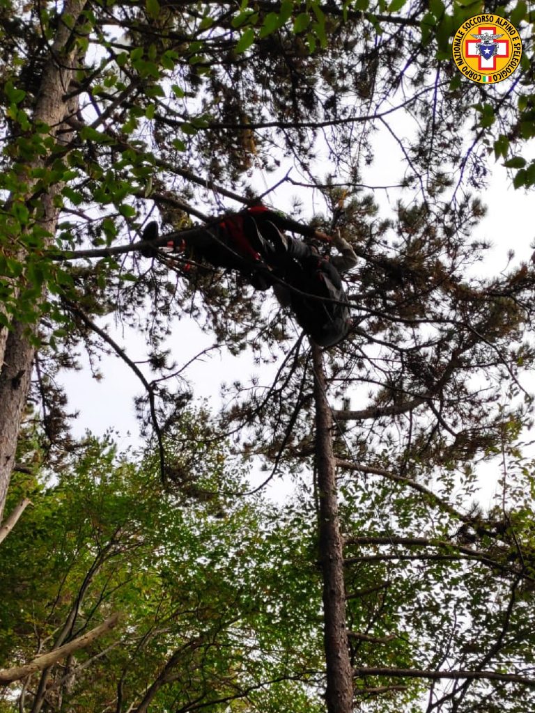 Recuperata pilota di parapendio sospesa tra gli alberi