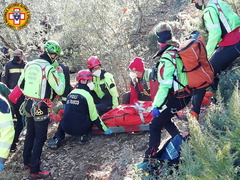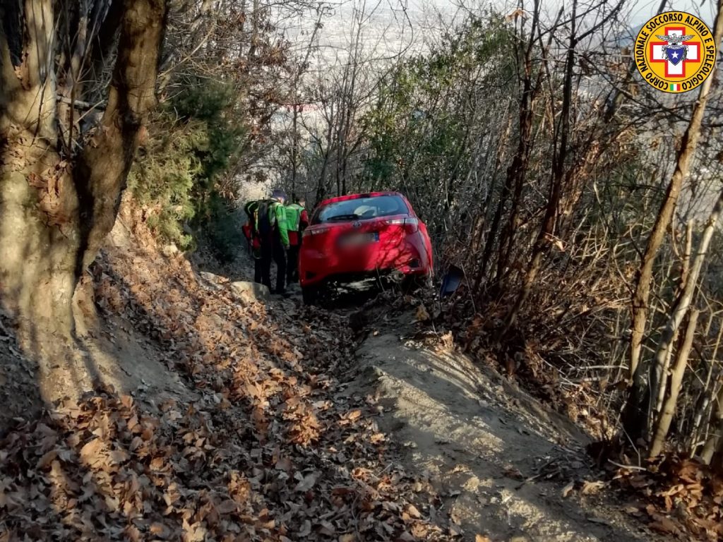 Caricata in barella, l'infortunata è stata poi trasportata a spalla per un centinaio di metri fino all'ambulanza. Il suo cane, che stava bene, è stato ritrovato all'interno dell'auto.