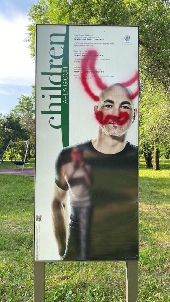 CAMPOFORMIDO. "Mi fa male, ma la devo pubblicare perché chi ha fatto una cosa del genere, SECONDO ME, ha un grosso problema e va aiutato". Sono le prime dichiarazioni del vicesindaco Christian Romanini da poco informato dell'imbrattamento avvenuto notte tempo dai vandali a danno del cartello area giochi intitolata alla memoria di Robert Miles.