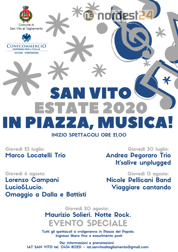 E’ stato così predisposto il programma “San Vito estate 2020 - In Piazza , musica” che come già si evidenzia dal titolo propone un cartellone di eventi musicali. Un calendario ricco di appuntamenti che si svolgerà in centro storico, in piazza del Popolo, “salotto “ buono cittadino che per l’occasione farà da sfondo a eventi a ingresso libero, fino a esaurimento posti. Tutti gli eventi inizieranno alle 21. In questo modo l’afflusso di pubblico sarà meglio gestibile e saranno coinvolte anche le attività commerciali. Infatti, Confcommercio Ascom Pordenone, delegazione di San Vito contribuisce alla realizzazione del programma, così da incentivare il richiamo di spettatori e visitatori, contribuendo a rivitalizare un settore che risente pesantemente, come nel resto della regione e d’Italia, degli effetti del coprifuoco causa emergenza sanitaria.