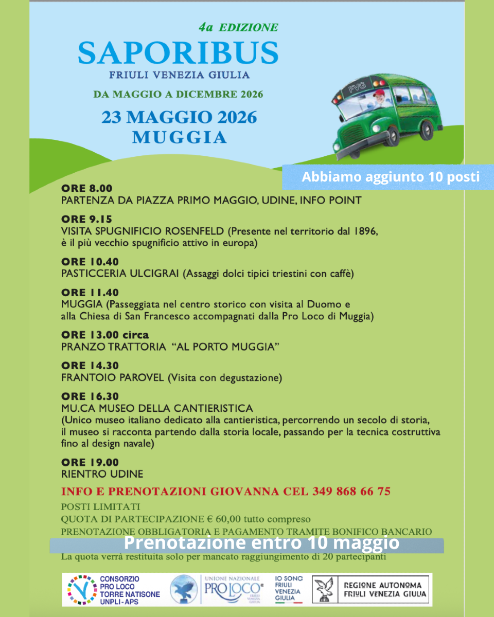 MUGGIA (TS) - Dopo il successo delle precedenti edizioni, torna sabato 23 maggio “Saporibus”, il bus del gusto con partenza e rientro dal centro di Udine, che attraversa il Friuli Venezia Giulia unendo enogastronomia, cultura e mobilità sostenibile. Giunto alla quarta edizione, il progetto è promosso dal Consorzio Pro Loco Torre Natisone UNPLI APS e si conferma un format capace di valorizzare territori e tradizioni locali attraverso un turismo lento e consapevole.