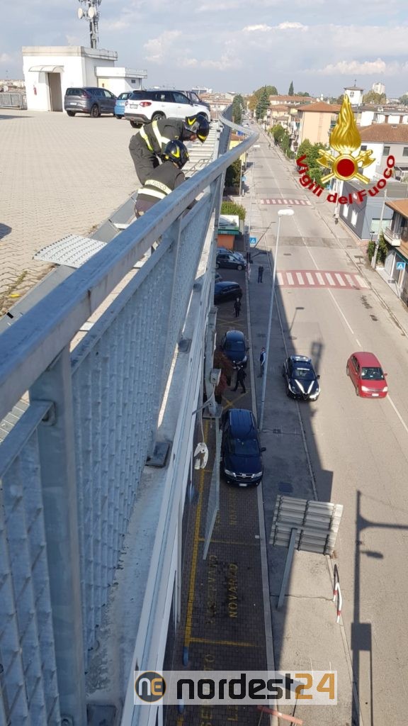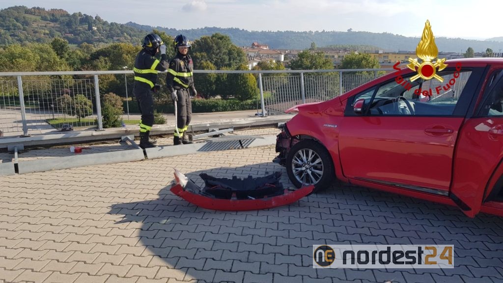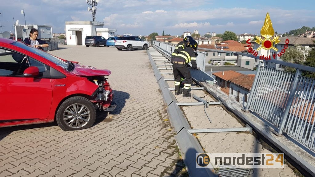 VICENZA. Alle 14:45, i vigili del fuoco sono intervenuti in viale Sant'Agostinoa Vicenza per mettere in sicurezza un'auto sul terrazzo di un fabbricato, che durante una manovra da parte della conducente ha divelto il parapetto, rischiando di precipitare dal terzo piano.