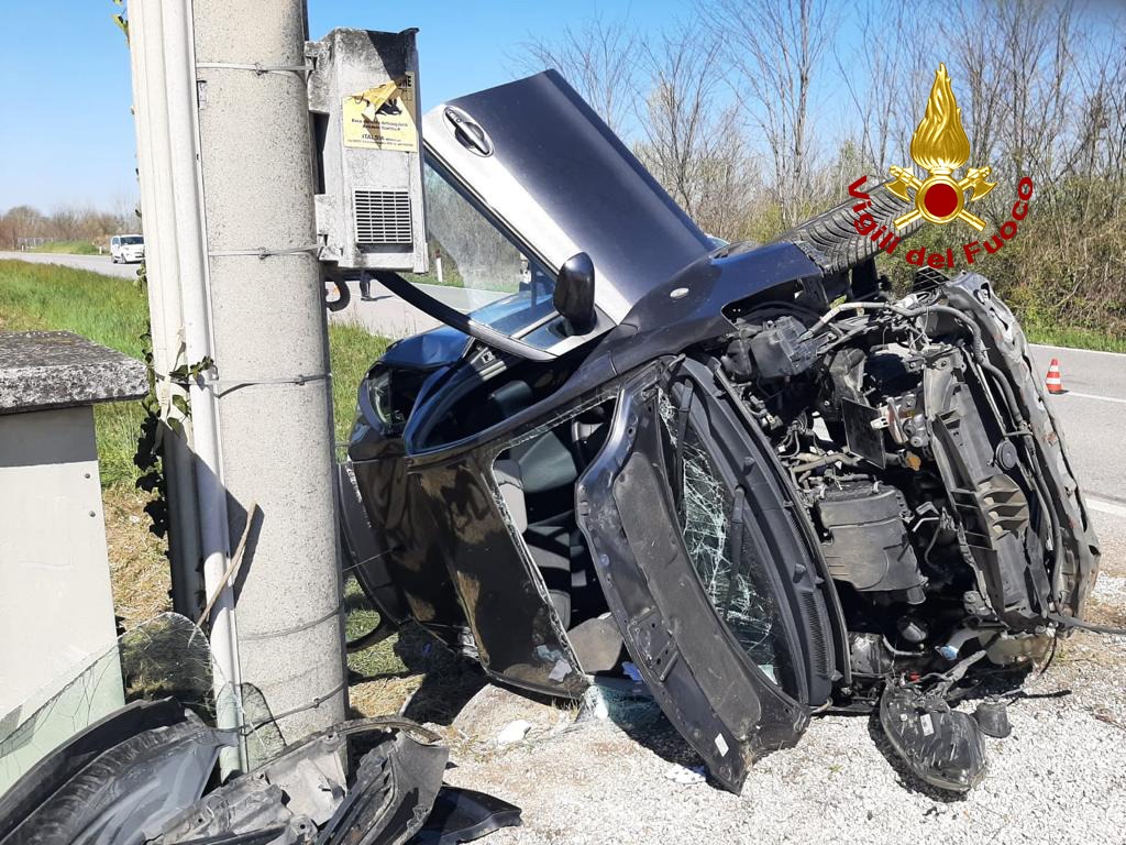 VILLA DEL C0NTE (PADOVA). Alle ore 10:45, di lunedì, i vigili del fuoco sono intervenuti lungo la SP 58 in Via Guglielmo Marconi a Villa del Conte in provincia di Padova per un’auto finita rovesciata contro un palo di cemento, dopo la perdita di controllo del mezzo da parte della conducente, rimasta ferita.