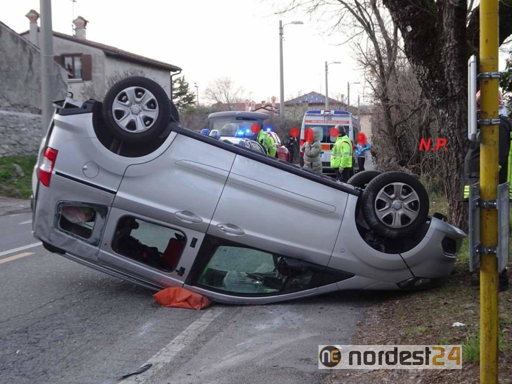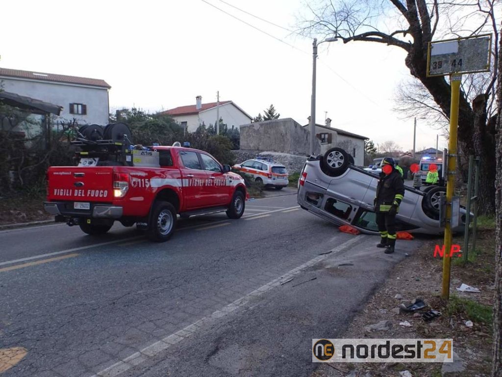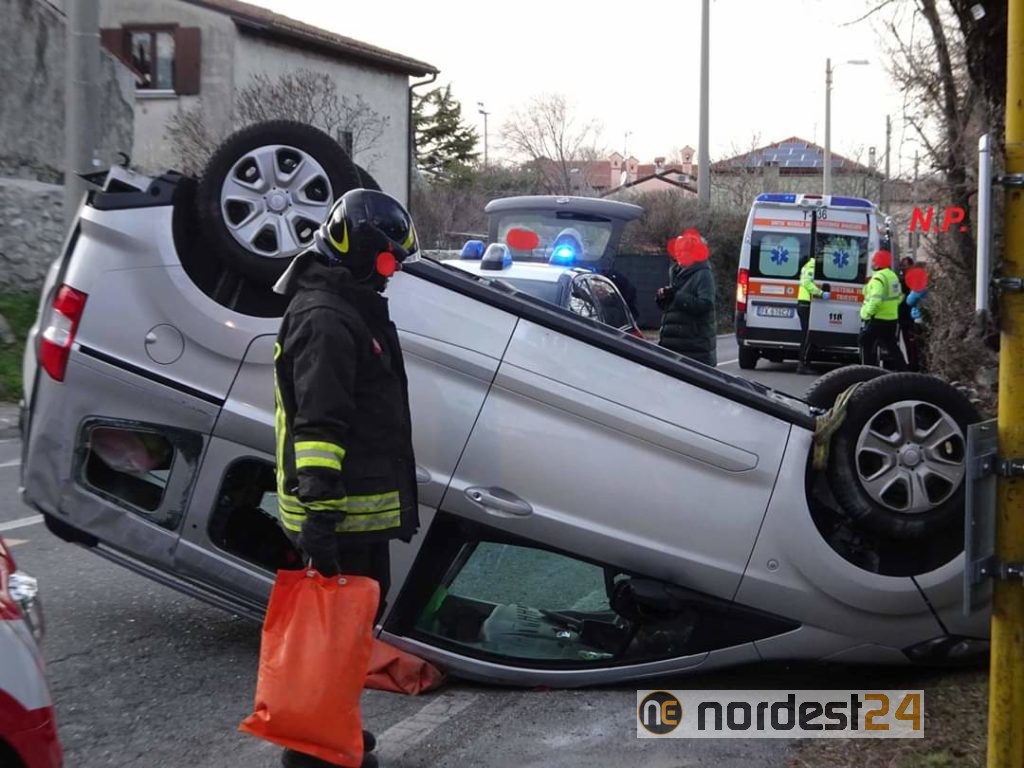 Per cause in corso di accertamento una Ford su cui viaggiavano in totale 5 persone, cercando di evitare un'automobile immettendosi sulla Sp1 proveniendo da Prosecco, si è cappottata.