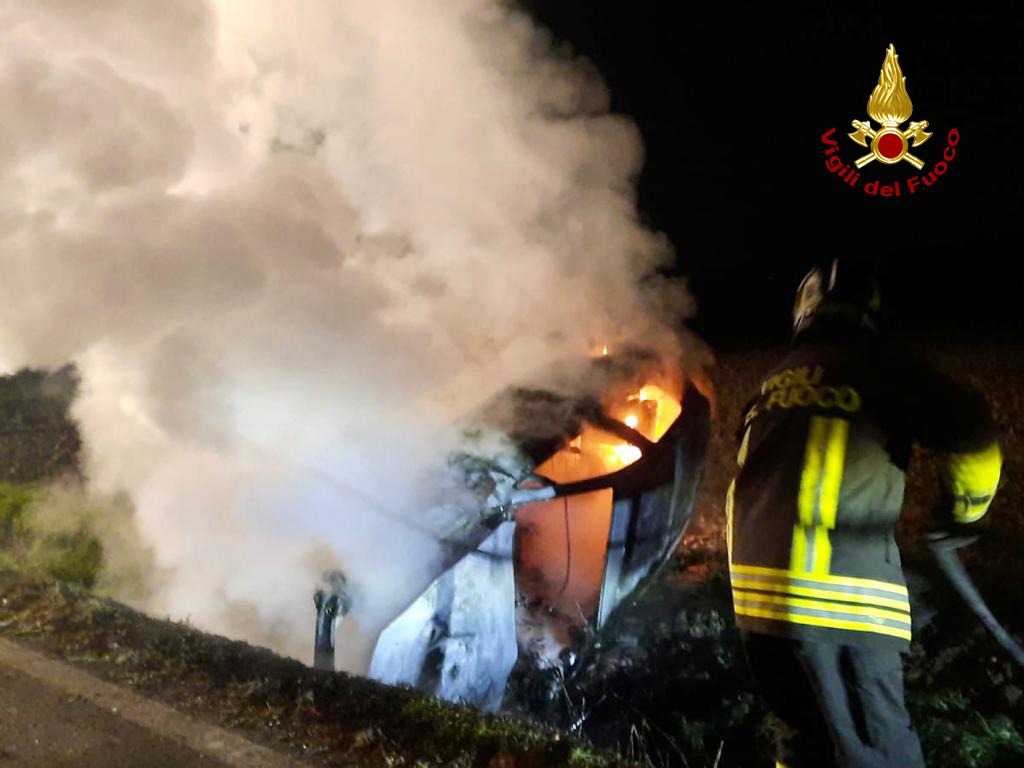 Alle 20:00, di mercoledì, i vigili del fuoco sono intervenuti lungo la SP 84 in Via Tezzon a Pozzonovo in provincia di Padova per l’incendio di un’auto a seguito di una fuoriuscita autonoma di strada del conducente, rimasto illeso.
