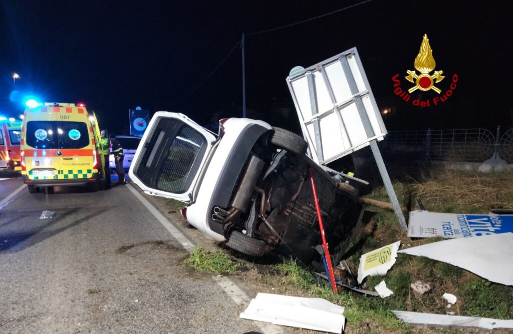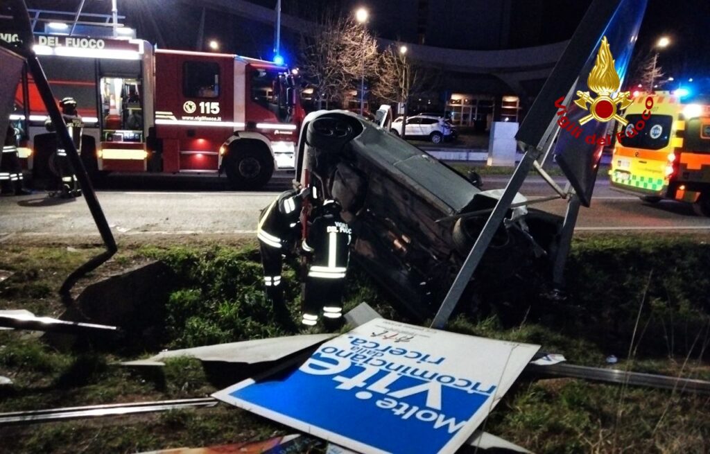 Sbandano con l'auto, centrano i cartelloni pubblicitari e si ribaltano: 2 feriti