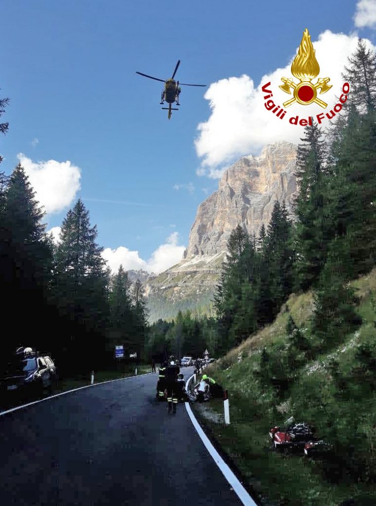 I pompieri arrivati da Cortina hanno collaborato con il personale sanitario del SUEM nel soccorso al motociclista straniero, che è stato stabilizzato per essere elitrasportato in ospedale. Sul posto i carabinieri per i rilievi del sinistro.