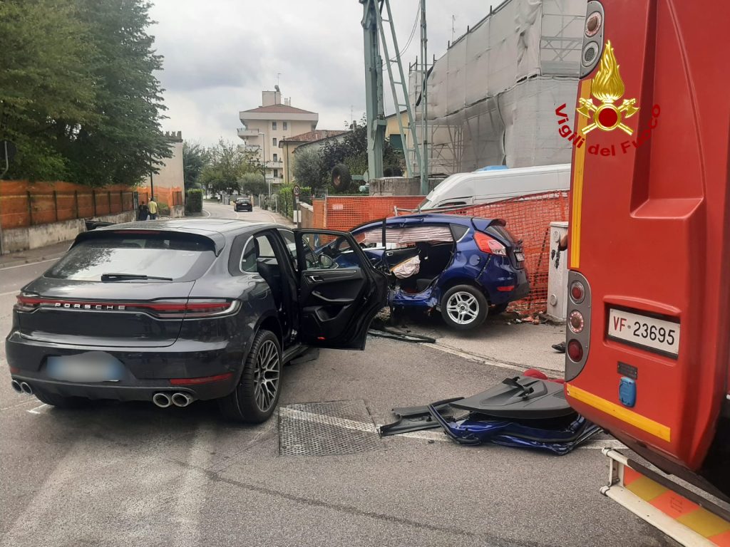 Scontro tra una Porsche Cayenne e una Ford Fiesta: donna ferita, incastrata tra le lamiere