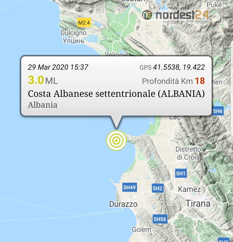 Un terremoto di magnitudo ML 3.0 è avvenuto oggi 29 marzo 2020 alle ore 15:37 italiane nella zona della Costa Albanese settentrionale con coordinate geografiche (lat, lon) 41.55, 19.42 ad una profondità di 18 km.