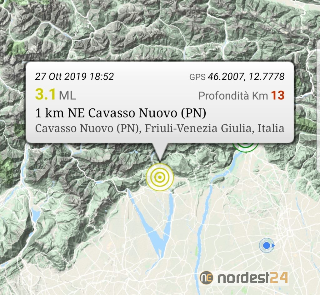 Il fenomeno ha fatto registrare una intensità pari a 3.1 della scala Richter a 2 km ESE di Cavasso Nuovo (Pordenone) alle 18.52 di oggi, domenica 27 ottobre 2019.