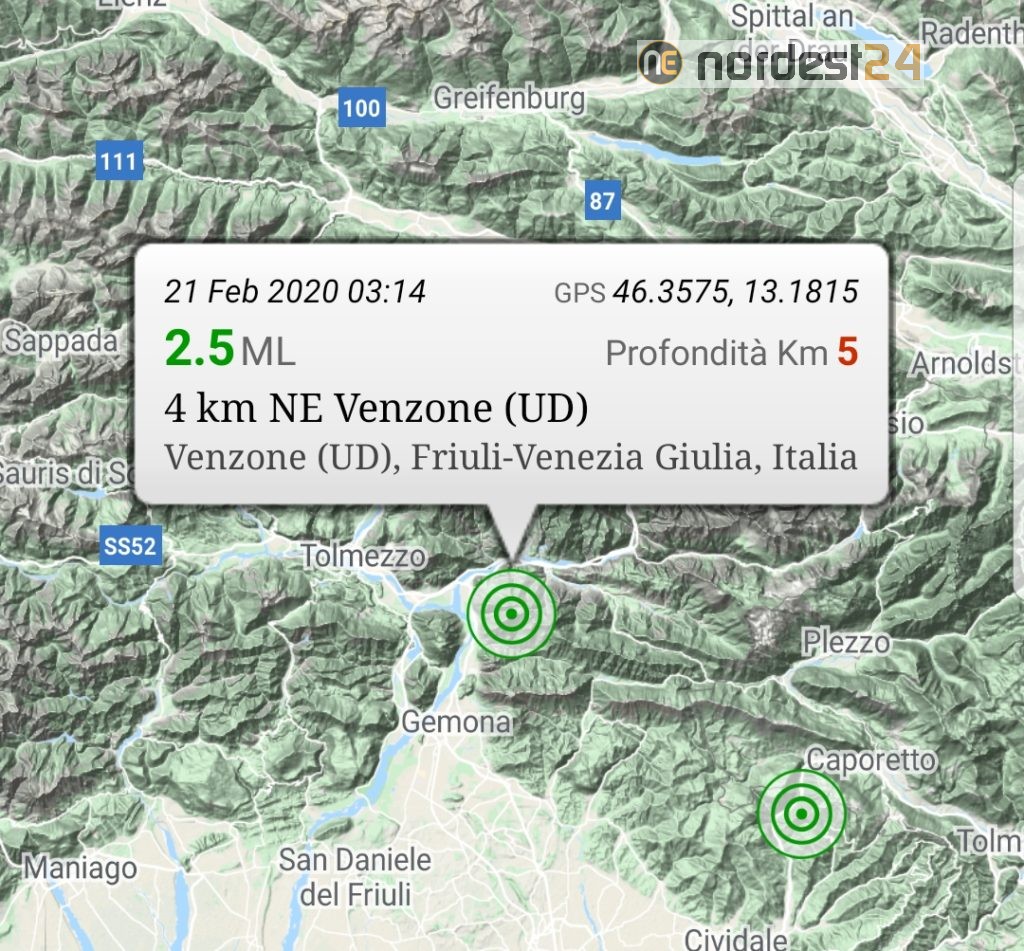 Un terremoto di magnitudo ML 2.5 è avvenuto nella zona a 4 km NE di Venzone (UD), venerdì 21 febbraio alle ore 03:14 con coordinate geografiche (lat, lon) 46.36, 13.18 ad una profondità di 5 km.