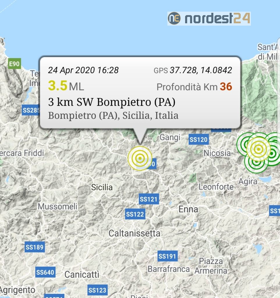 Un terremoto di magnitudo ML 3.5 è avvenuto a 3 km SW Bompietro (PA) oggi venerdì 24 aprile 2020 alle ore 16:28 con coordinate geografiche (lat, lon) 37.73, 14.08 ad una profondità di 36 km.