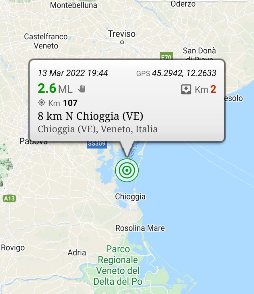 Un terremoto di magnitudo ML 2.6 è avvenuto nella zona a 8 km N di Chioggia (VE), il 13-03-2022 alle ore 19:44 con coordinate geografiche (lat, lon) 45.294, 12.263 ad una profondità di 2 km.