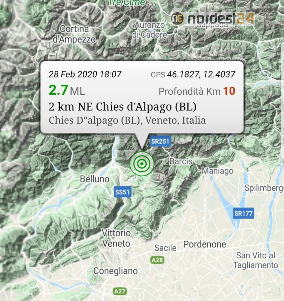 Un terremoto di magnitudo ML 2.7 è avvenuto nella zona: 2 km NE Chies d'Alpago (BL), il 28-02-2020 alle ore 18:07:32 con coordinate geografiche (lat, lon) 46.18, 12.4 ad una profondità di 10 km.
