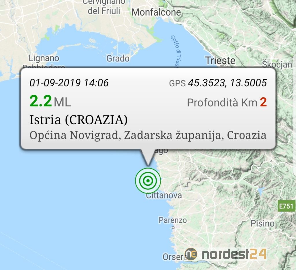 Un terremoto di magnitudo ML 2.2 è avvenuto nella zona: Istria (CROAZIA), il 01-09-2019 14:06:35 (UTC +02:00) ora italiana con coordinate geografiche (lat, lon) 45.35, 13.5 ad una profondità di 2 km.