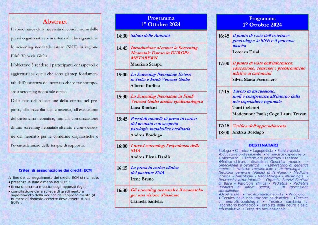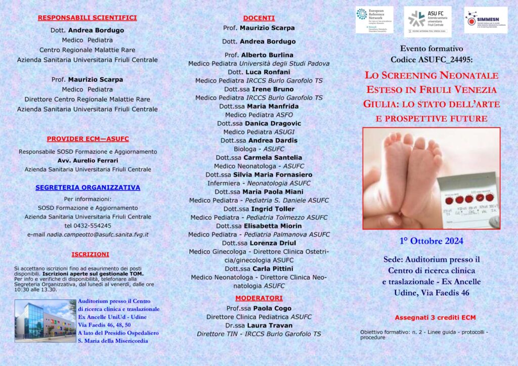 Il Convegno, voluto fortemente dal Centro Regionale di Malattie Rare di Udine, e coordinato dal Professor Maurizio Scarpa e dal dr Andrea Bordugo, in stretta collaborazione con l’Istituto per l’ Infanzia Burlo Garofolo di Trieste, tratterà tutti gli aspetti di questa importantissimo progetto di prevenzione a partire dalla gravidanza fino alla nascita e all’ assistenza al neonato.