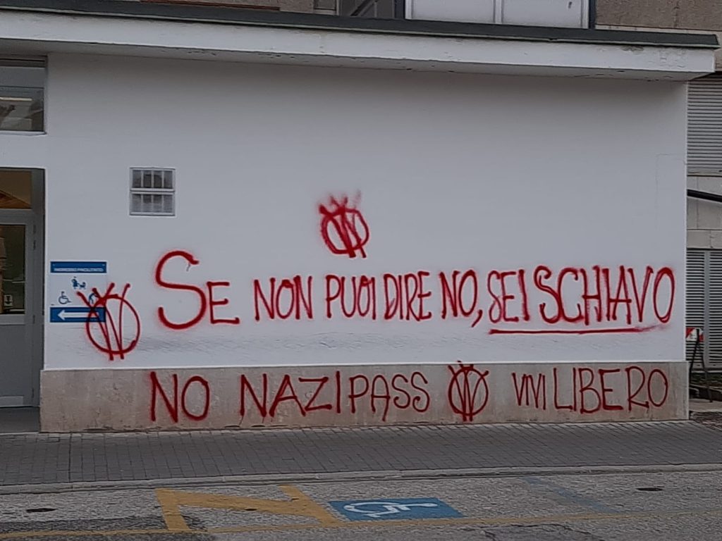 "Se non puoi dire no sei schiavo, il vax uccide, no Nazipass vivi Libero", sono solo alcune delle scritte comparse nottetempo con i consueti simboli appartenenti a persone che considerano la vaccinazione anti covid un veleno in grado di uccidere le persone. Ora non resta che attendere la copertura e rimozione delle scritte che con ogni probabilità avverrà già nella giornata odierna.