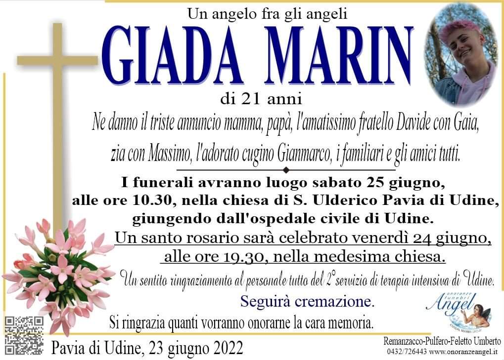 PAVIA DI UDINE. Si è spenta la 21enne Giada Marin, la giovane di Pavia di Udine ricoverata in gravi condizioni all'ospedale Santa Maria della Misericordia di Udine dopo essere rimasta coinvolta in un'incidente avvenuto nella notte fra venerdì 10 e sabato 11 giugno.