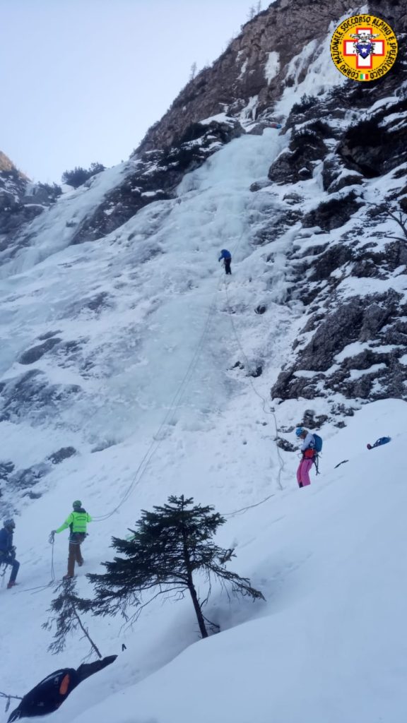 Grazie alle motoslitte della Polizia, in servizio presso i campetti di Nevelandia, e di Promotur i quattro tecnici sono arrivati velocemente sull'obiettivo prendendo un percorso diretto. I compagni di cordata del ferito lo avevano nel frattempo calato a terra - l'incidente è avvenuto alla seconda lunghezza di corda - e il ferito è rimasto sempre presente e stabile fino all'arrivo dei soccorritori. I soccorritori lo hanno imbarellato e portato a spalle in discesa lungo un secondo itinerario, per evitare alcuni alberi caduti presenti sul percorso seguito in salita che avrebbero complicato il passaggio, e in circa trenta minuti lo hanno condotto a valle. Sul posto era nel frattempo arrivato l'elisoccorso regionale per altre chiamate legate ad incidenti di pertinenza dei campetti di Nevelandia e delle piste da sci e la Sores ha consigliato di sottoporre anche il ghiacciatore ferito alla disamina del medico di bordo.