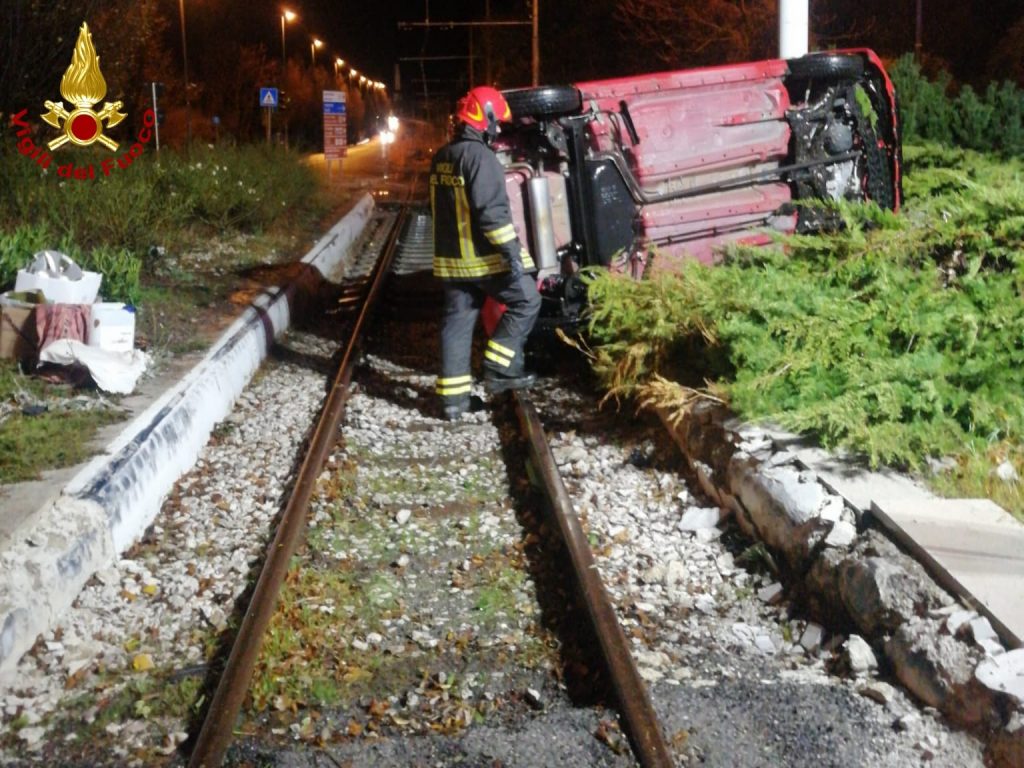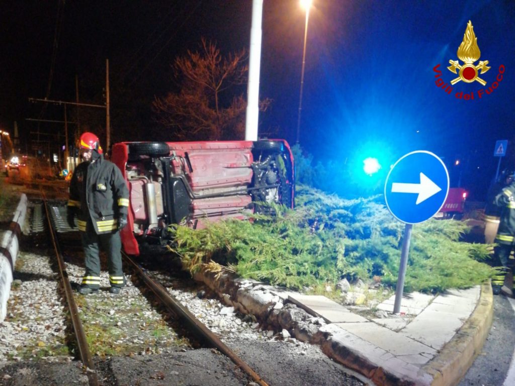 Un cinquantacinquenne alla guida di una Toyota Aygo, per cause da accertare, si è ribaltato sul fianco ultimando la sua corsa sulla linea tranviaria che attraversa il quadrivio.
