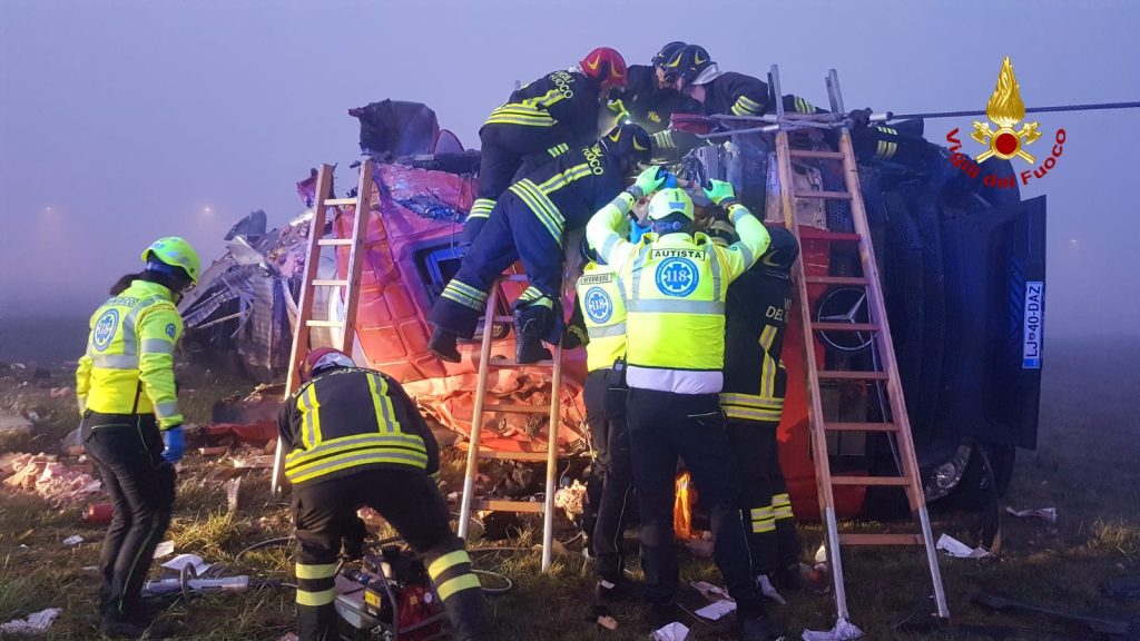 I pompieri arrivati da Mestre, con un’autopompa, un’autobotte, l’autogrù e successivamente il nucleo NBCR (Nucleare Biologico chimico radiologico) e 12 operatori, hanno messo in sicurezza il mezzo ed utilizzando cesoie, divaricatori e martinetti idraulici estratto l’autista rimasto incastrato nella cabina di guida. Il ferito è stato preso in cura dal personale sanitario del SUEM stabilizzato e trasferito in ospedale.
