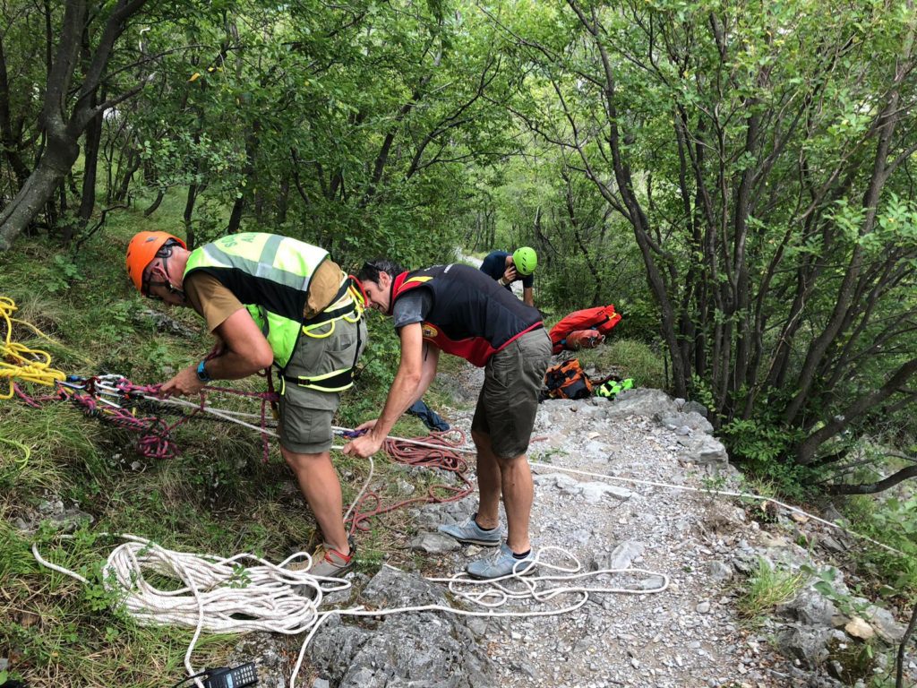 Per non percorrere tutto il torrente in discesa si è deciso di trasportarlo per un tratto in salita fino alla strada soprastante e per questo si è reso necessario assicurare la portantina e i tecnici con le corde di sicurezza.
