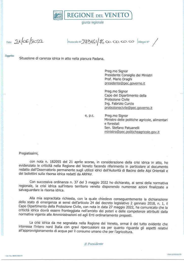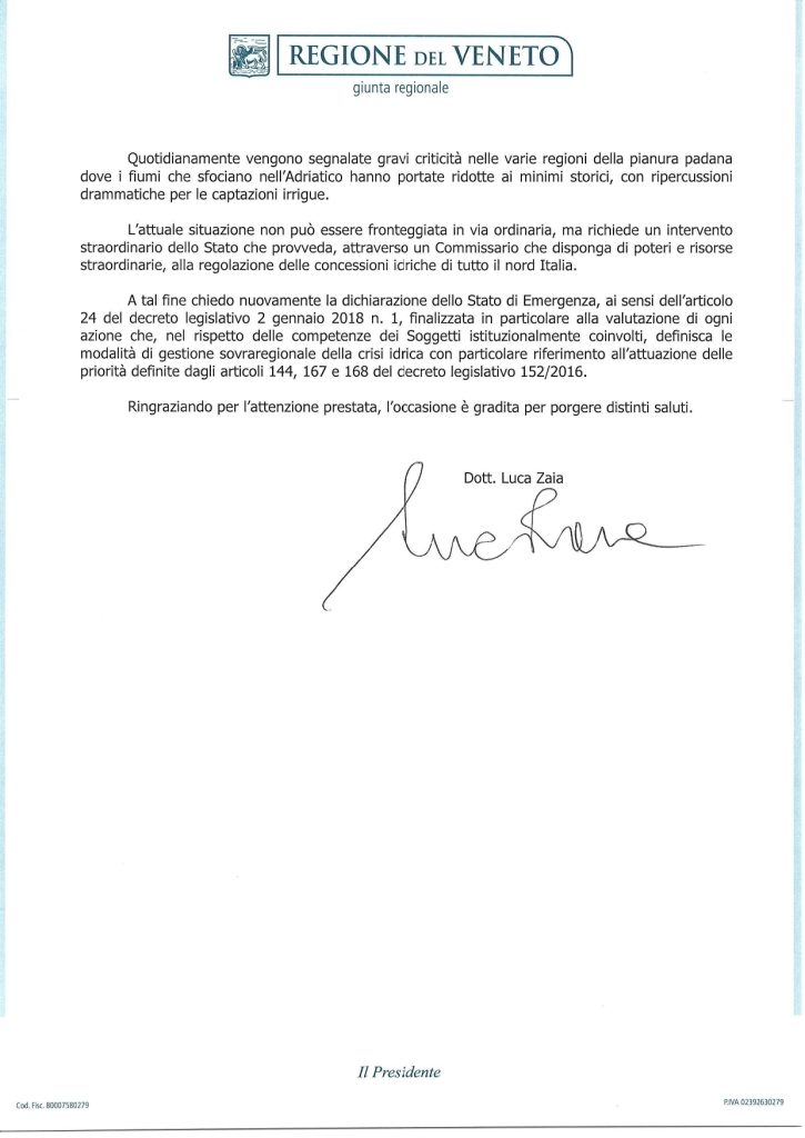 «Ho scritto al Presidente del Consiglio sollecitando l’immediata dichiarazione dello stato di emergenza come avevo già fatto ormai il 21 aprile - riferisce Luca Zaia, Presidente del Veneto -. Allora richiedevo di valutare la dichiarazione dello ‘Stato di emergenza’ finalizzata ad ogni opportuna azione che possa definire le modalità di gestione sovraregionale della crisi idrica. Nel documento ho anche auspicato un congruo sostegno economico al fine di assicurare tutti quegli interventi necessari per assicurare la pubblica incolumità, il ripristino dei danni subiti dal patrimonio sia pubblico sia privato e le normali condizioni di vita della popolazione».