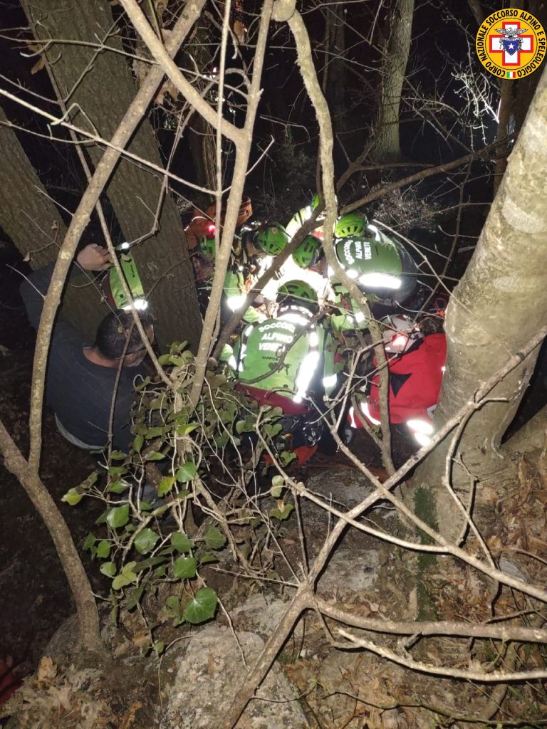 Sette soccorritori, più un settimo del Soccorso speleologico che abita nelle vicinanze, hanno raggiunto il luogo dell'incidente, una cinquantina di metri sopra la strada, dove si trovava già il personale medico dell'ambulanza di Verona emergenza, che aveva prestato le prime cure. Stabilizzato e caricato sulla barella portantina, l'infortunato è stato calato fino alla strada e affidato all'ambulanza. L'intervento si è concluso verso l'una di notte.