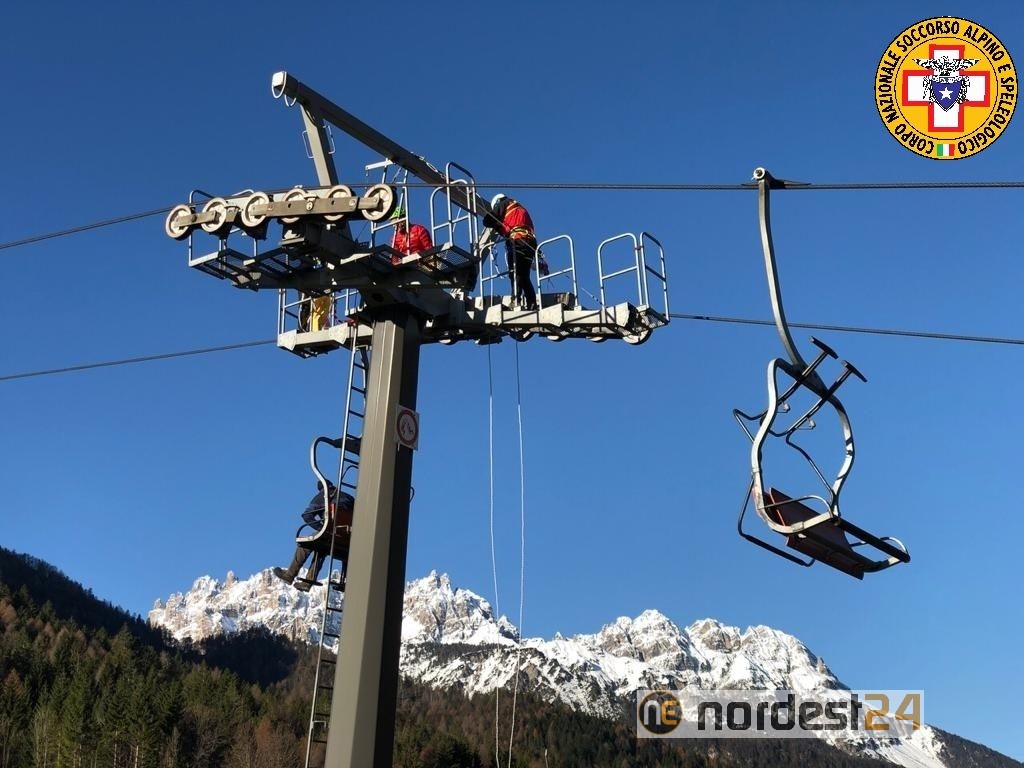 Per il soccorso su impianti di risalita - le esercitazioni del Soccorso Alpino e Speleologico avvengono su ogni comprensorio sciistico annualmente - i tecnici risalgono il pilone più vicino e con l'aiuto di una corda, manovrata da terra da un altro soccorritore, si spostano con un sistema a carrucola lungo i cavi passando da un sedile all'altro e calando a terra man mano le persone bloccate.
