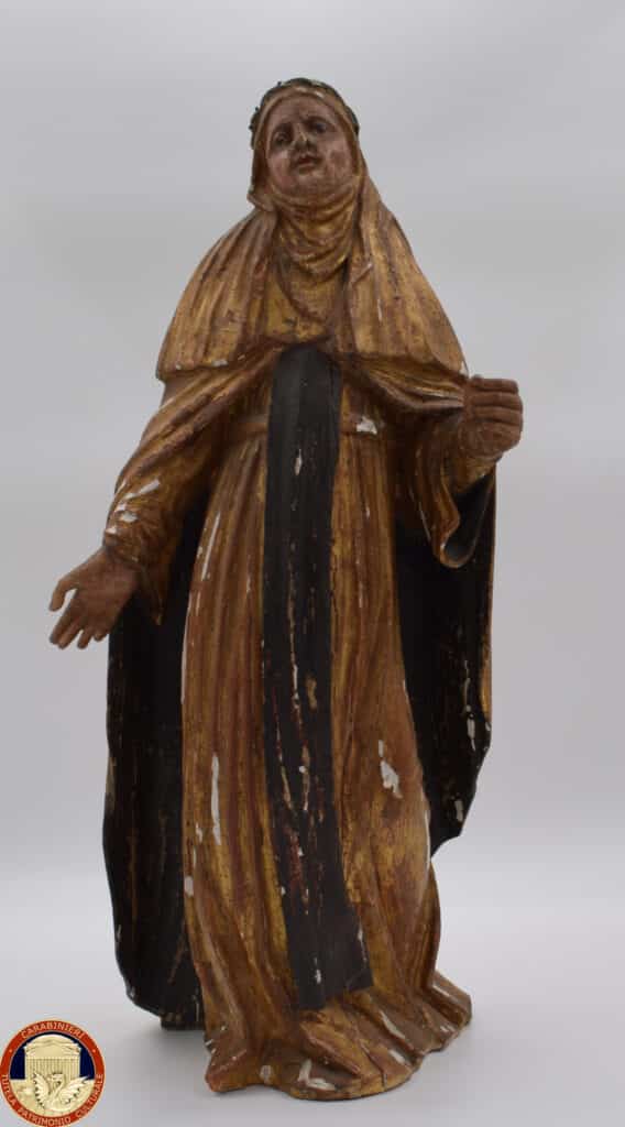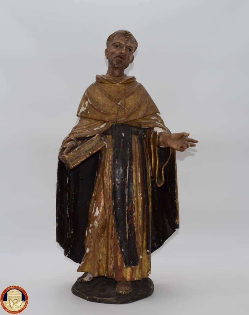 SAURIS DI SOPRA (UDINE) - Oggi, 27 aprile, i Carabinieri del Nucleo Tutela Patrimonio Culturale di Udine hanno riconsegnato alla Chiesa di San Lorenzo, a Sauris di Sopra, due preziose statue lignee policrome del XVII secolo, raffiguranti San Domenico e Santa Teresa. I manufatti erano stati sottratti nel maggio del 1969 dall'interno dell'edificio sacro, dove originariamente adornavano un polittico ligneo insieme ad altre opere della stessa bottega.