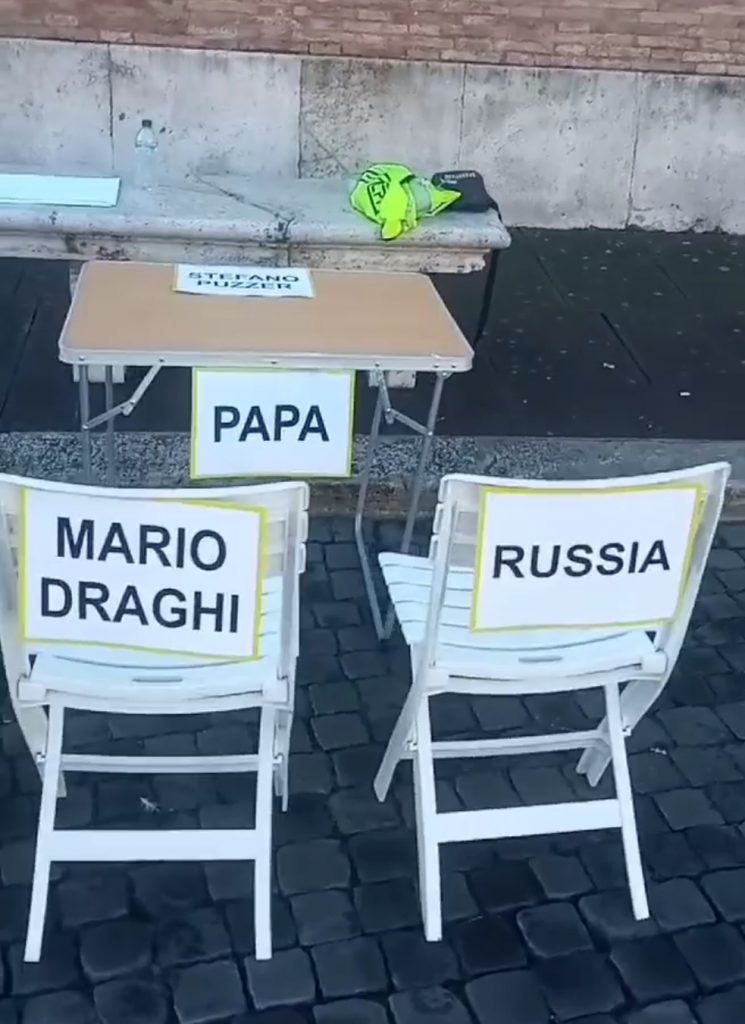 Nel video si vedono le sedie (vuote) intitolate a Mario Draghi, al Papa, alla Russia, agli Usa e alla Comunità Europea.