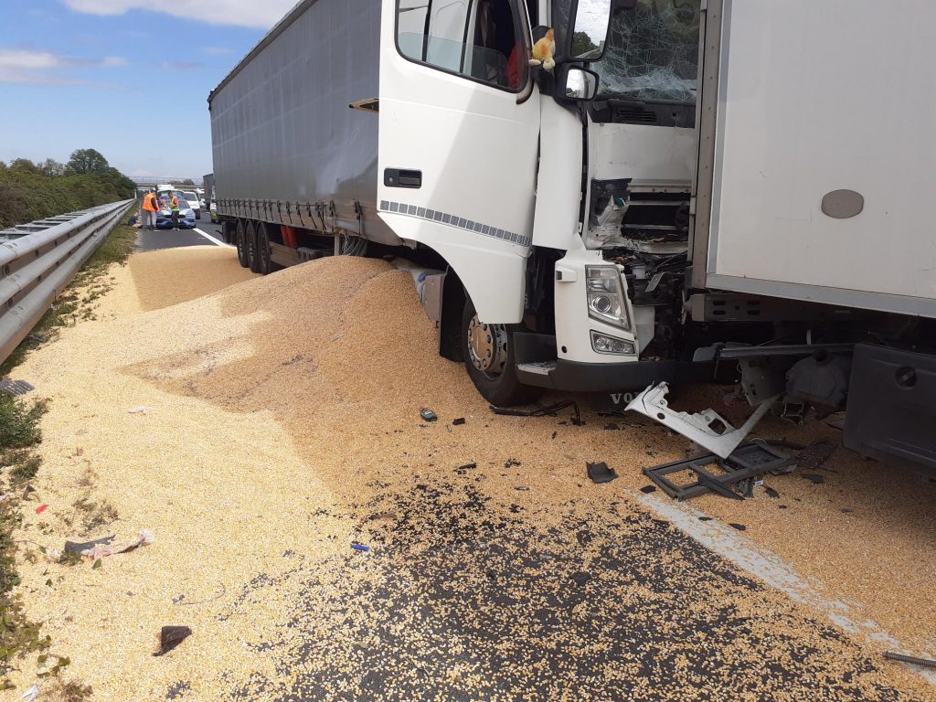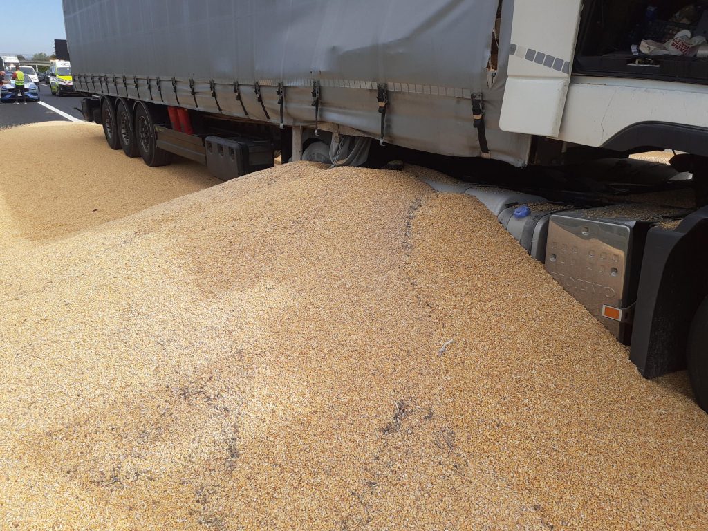 A seguito dell’impatto – avvenuto poco dopo le 13,00 di oggi martedì 21 settembre – non si registrano feriti, ma un autoarticolato ha perso l’intero carico di granaglie.