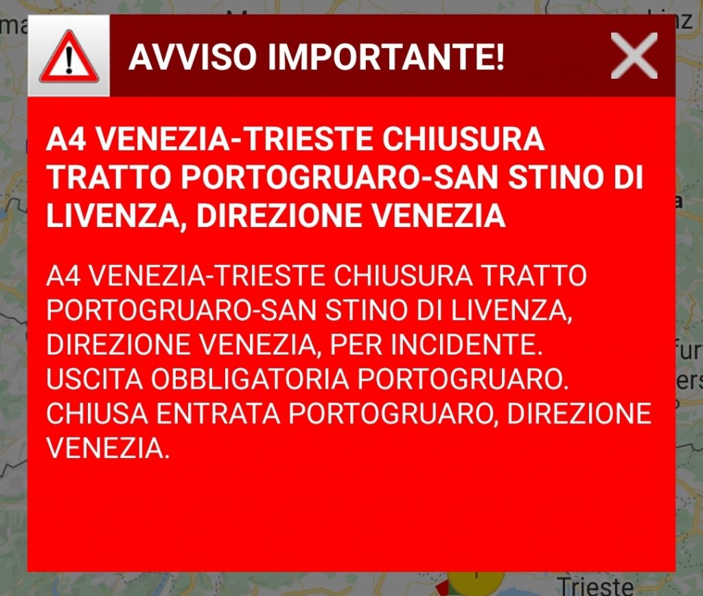 È stata istituita l’uscita obbligatoria a Portogruaro per chi proviene da Trieste con reindirizzamento del traffico in A28. Chiuso anche l’allacciamento del bivio A28 con ingresso in A4 in direzione Venezia.