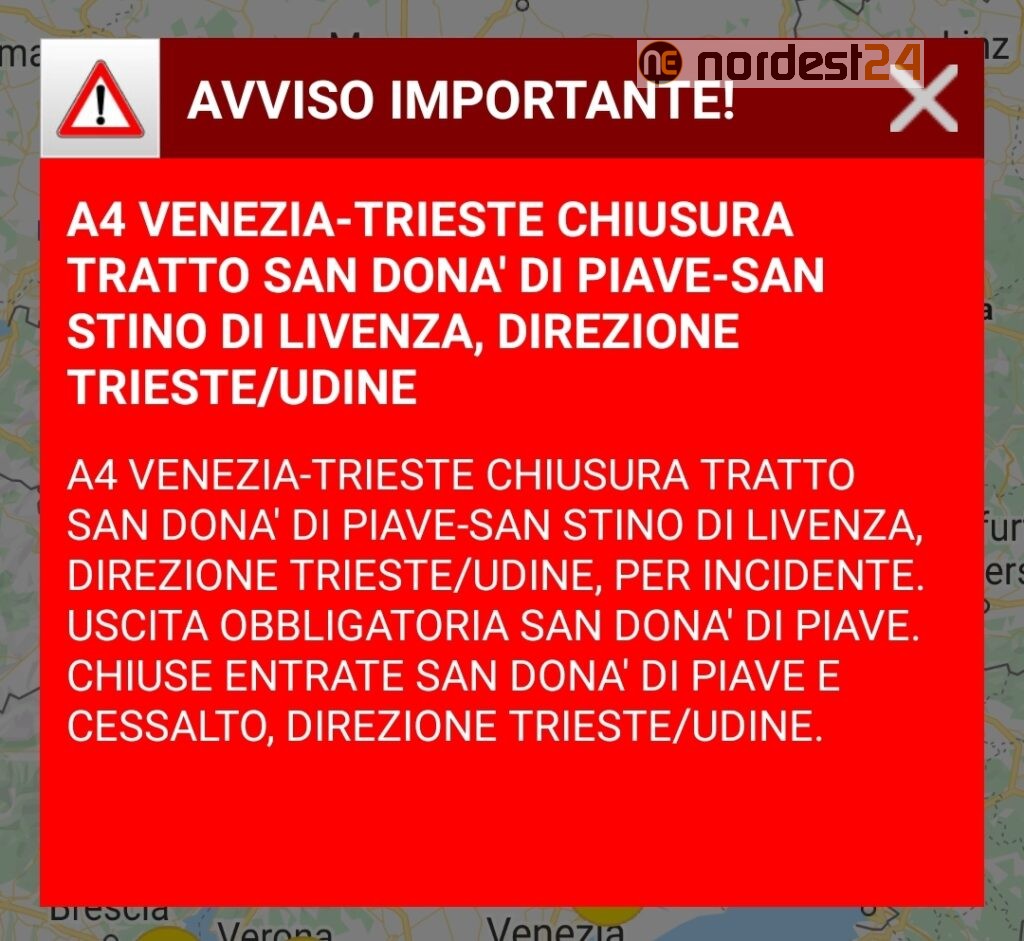 Autostrada A4 chiusa nel tratto tra San Donà di Piave e San Stino di Livenza in direzione Trieste a causa di un tamponamento avvenuto tra due autoarticolati e un veicolo leggero.