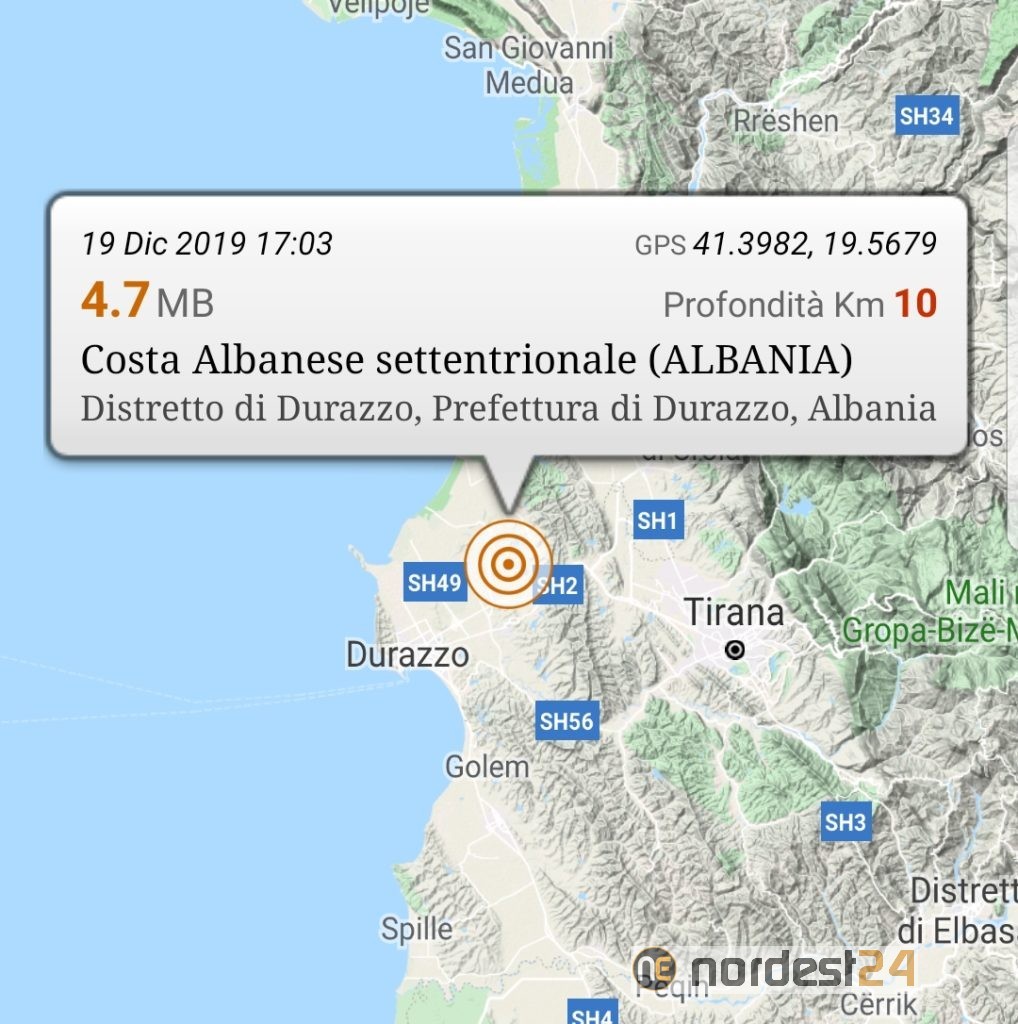 Un terremoto di magnitudo mb 4.7 è avvenuto nella Costa Albanese settentrionale (ALBANIA), il 19-12-2019 17:03:13 (UTC +01:00) ora italiana con coordinate geografiche (lat, lon) 41.4, 19.57 ad una profondità di 10 km.