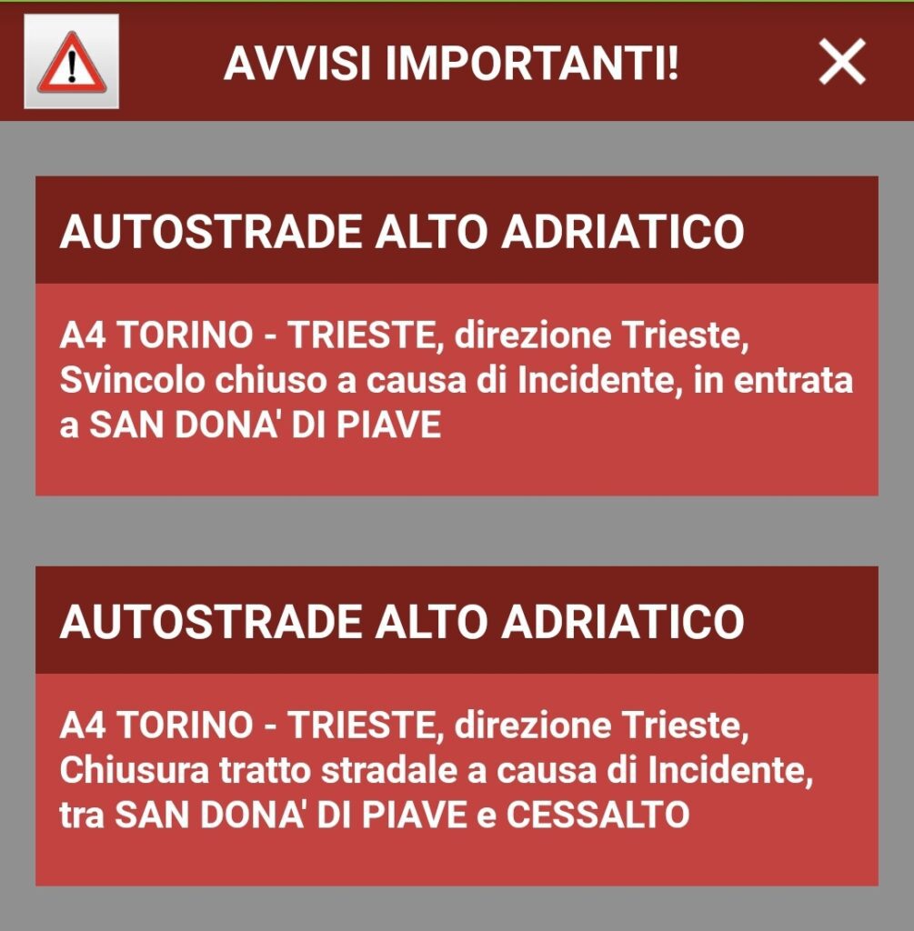 La Concessionaria Autostrade Alto Adriatico ha istituito l’uscita obbligatoria allo svincolo di San Donà di Piave per chi proviene da Venezia a seguito di un incidente avvenuto al chilometro 426 (all’altezza del comune di Noventa di Piave) poco dopo le 10,00 di oggi martedì 30 aprile.