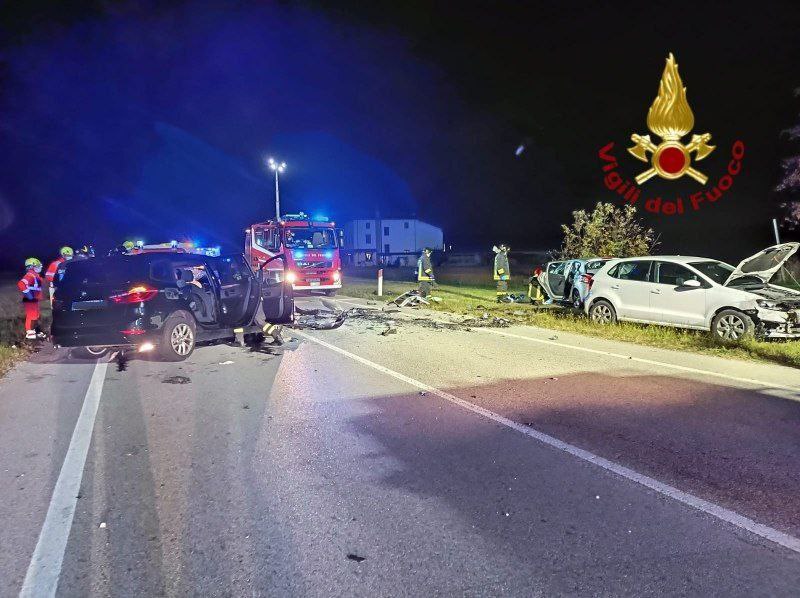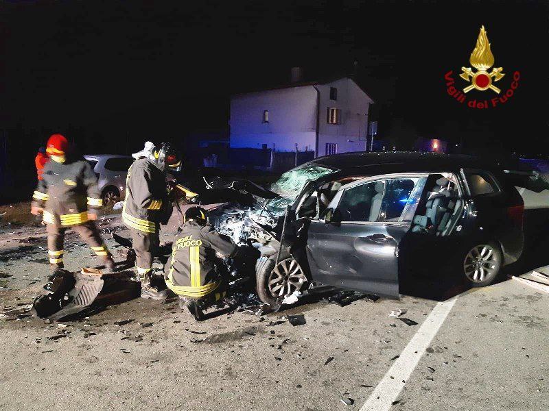 SAN VITO AL TAGLIAMENTO. Due squadre di vigili del Fuoco provenienti dal distaccamento di San Vito al Tagliamento e dalla sede centrale di Pordenone, sono intervenute ieri sera lunedì 15 novembre 2021 verso le 19 sulla SP21 tra San Vito al Tagliamento e Rivatte per un violento e tragico incidente stradale che ha coinvolto tre autovetture.