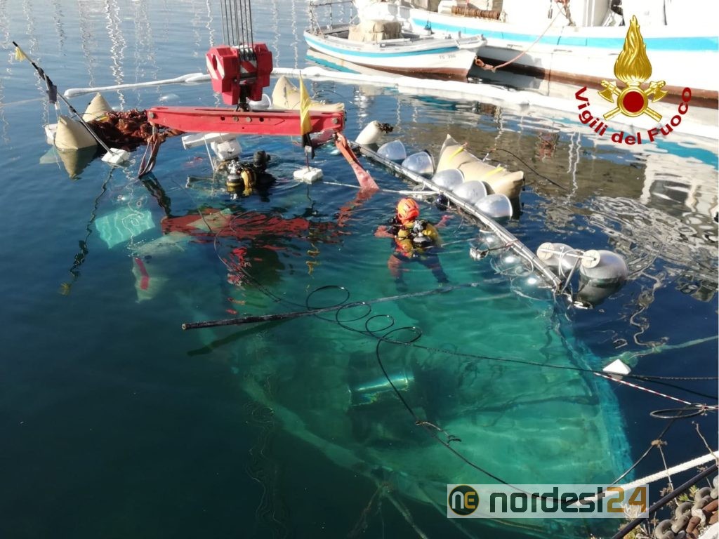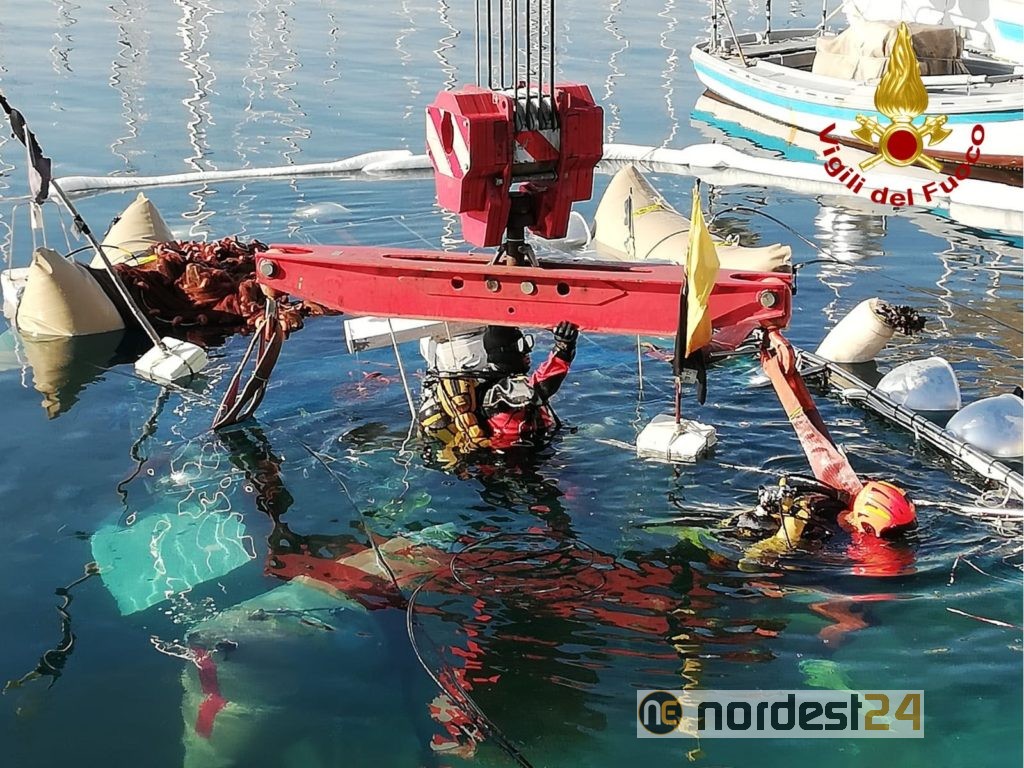 Dopo un primo sopralluogo effettuato nei giorni scorsi per verificare lo stato dell’imbarcazione affondata, la stessa è stata dapprima sollevata dal fondale dai sub con l’ausilio di speciali palloni ad aria, quindi il natante è stato imbragato dall’autogru e, mediante un lungo e meticoloso lavoro di sollevamento, è stato portato in prossimità della superficie da dove è iniziata la fase di svuotamento tramite pompe ad immersione.