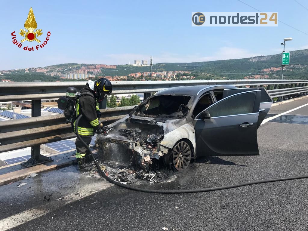 TRIESTE. Verso le 11.00 di oggi 9 giugno, la squadra del distaccamento di Muggia e la seconda partenza dei Vigili del fuoco del Comando provinciale di Trieste, sono intervenute sulla Grande viabilità all'altezza dello svincolo per Rabuiese, per un incendio di un'autovettura.