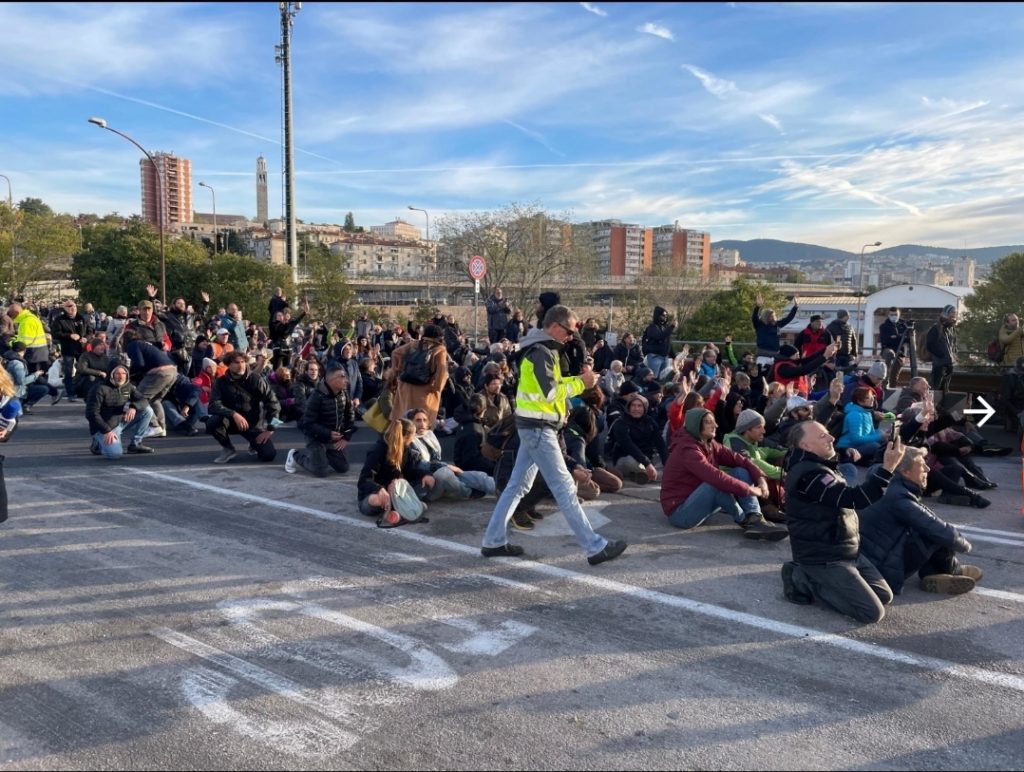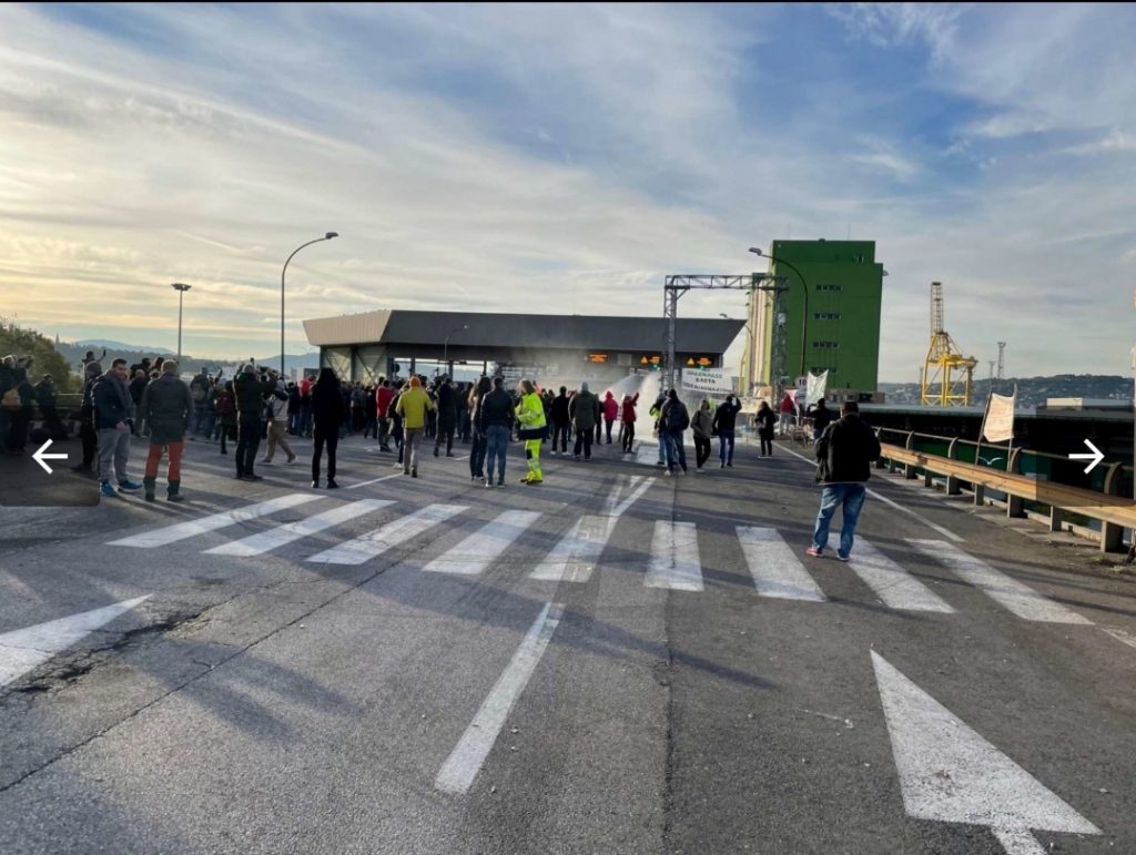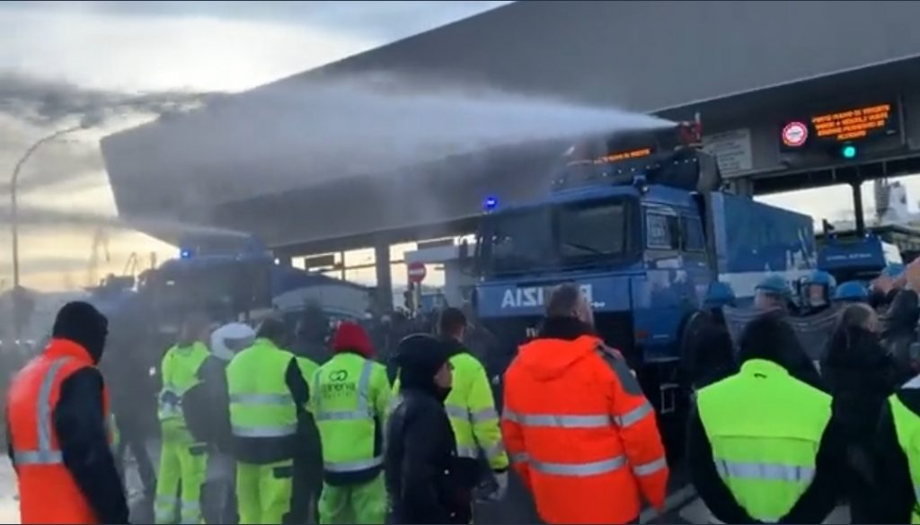 Mentre alcuni lavoratori portuali assieme ai manifestanti stanno liberando e pulendo la postazione di presidio allestita davanti al varco 4 del porto di Trieste, da dove da venerdì mattina hanno tenuto conferenze stampa e offerto cibo e bevande a chi partecipava alla protesta "no Green pass", è cominciato lo sgombero dei manifestanti che ancora stazionano. In azione gli idranti.