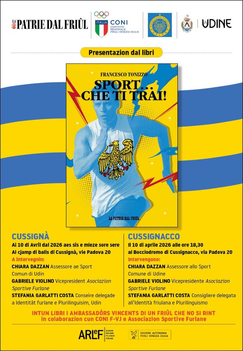 Un evento della Clape di culture Patrie dal Friûl in collaborazione con l’Ufficio Lingua Friulana del Comune, con il patrocinio del Comune di Udine, del CONI regionale e dell’ASF-Associazion Sportive Furlane. Saranno presenti, oltre all’autore, l’Assessora Comunale allo Sport Chiara Dazzan, la consigliera delegata al friulano Stefania Garlatti-Costa e il vice presidente dell’ASF Gabriele Violino.