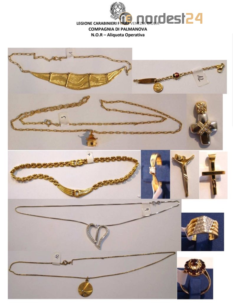 Nell’ambito di un attività d’indagine relativa ai reati contro il patrimonio recentemente condotta dalla Compagnia Carabinieri di Palmanova (UD) – N.O.R.M e coordinata dalla Procura della Repubblica di Udine, i militari rinvenivano e sequestravano un gran numero di monili in oro, visibilmente usati, costituiti da catenine da uomo e da donna, braccialetti, anelli, fedi nuziali, orecchini, ciondoli e medagliette.
