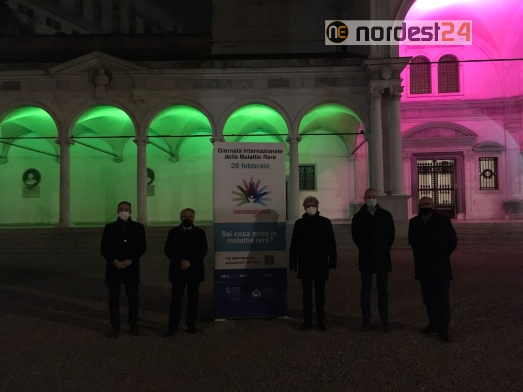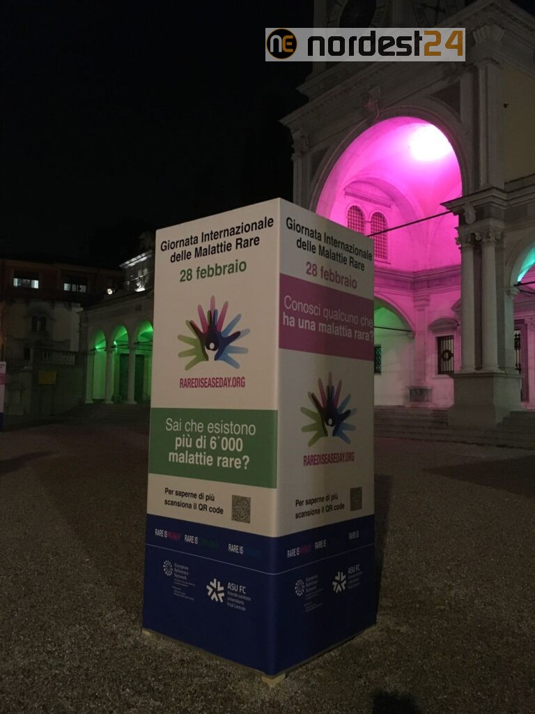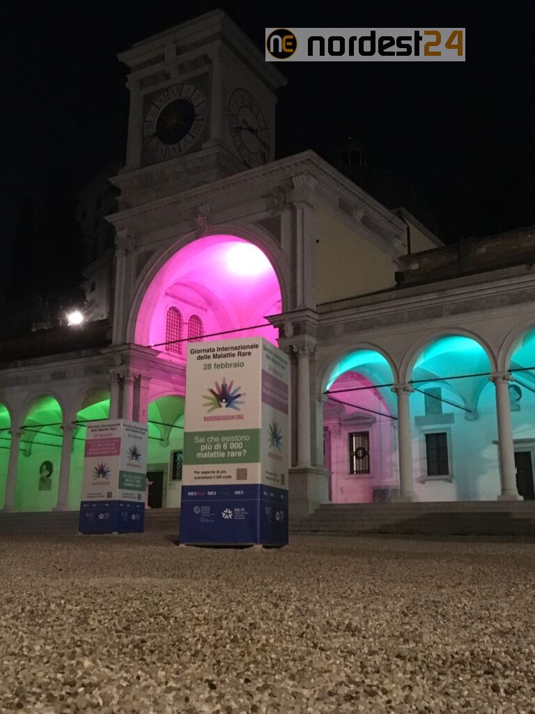 Anche a Udine si sono illuminati alcuni luoghi simbolo della città come Piazza libertà, Via Mercato Vecchio e la biblioteca V.Joppi di verde, blu e magenta, i tre colori della Giornata mondiale delle malattie rare.