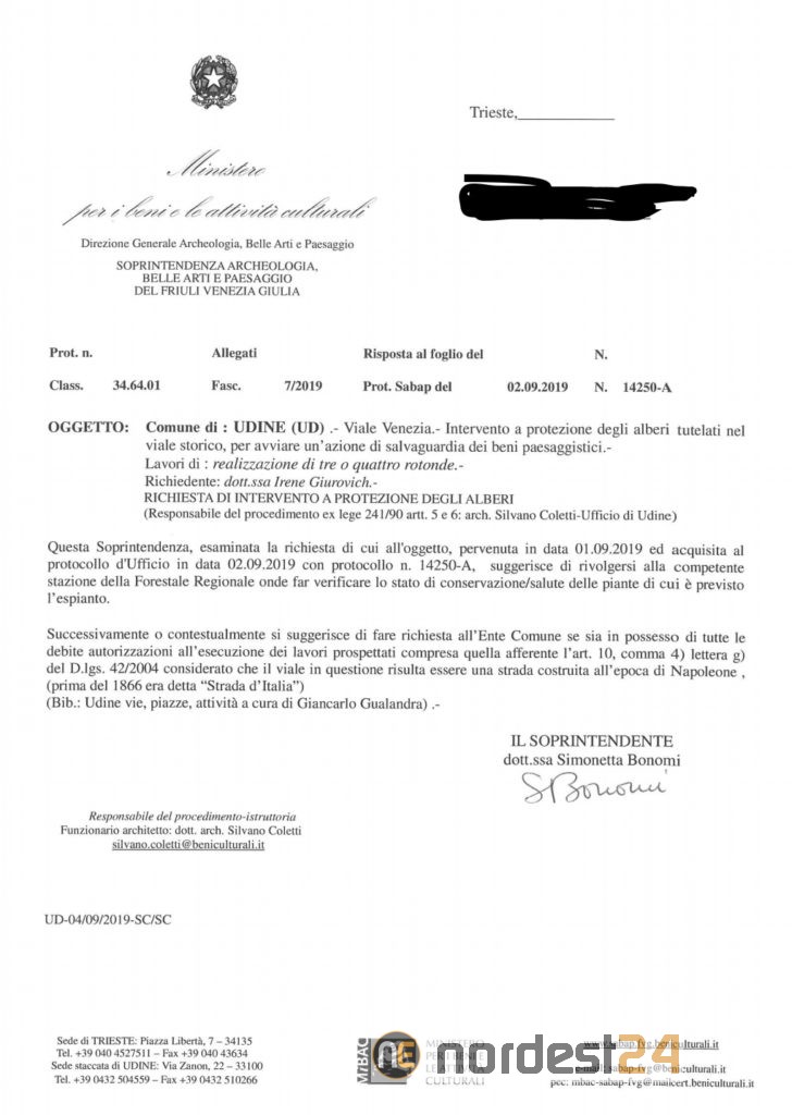 “Nella lettera firmata dalla Soprintendente FVG Simonetta Bonomi – rende noto la cittadina udinese Clara Moro attiva nella difesa del verde e della natura – si fa esplicitamente riferimento alla strada storica costruita da Napoleone e denominata strada d'Italia fino al 1866”, inoltre la Soprintendente aveva suggerito di contattare la Forestale regionale.