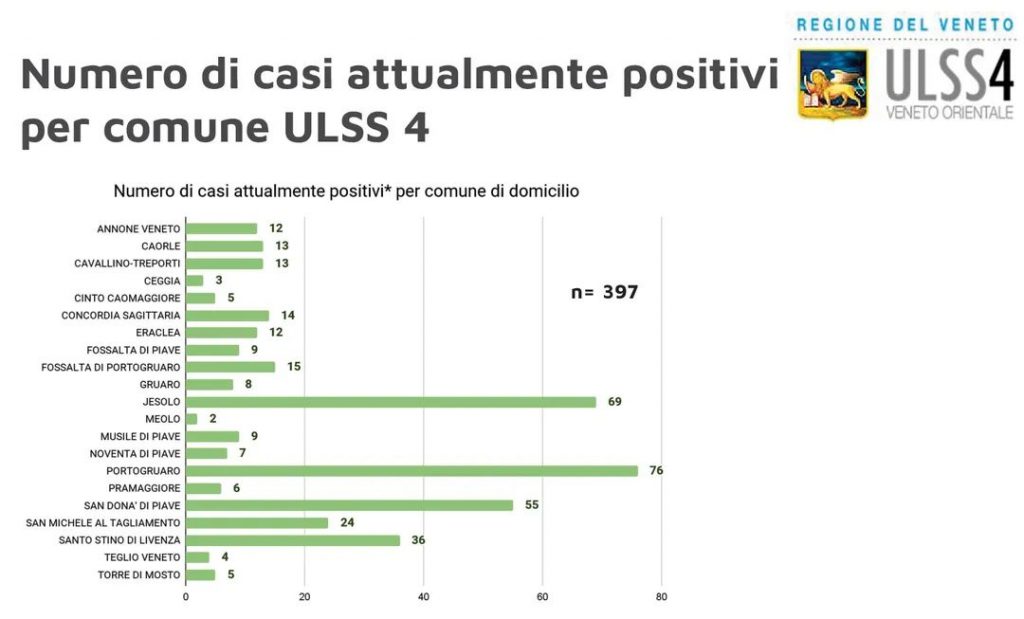 Sfiora quota 400 il numero delle persone attualmente positive nel territorio dell'Ulss4. Il trend dei contagi è in aumento da qualche giorno, il report per comune è indicato nel grafico sottostante.
