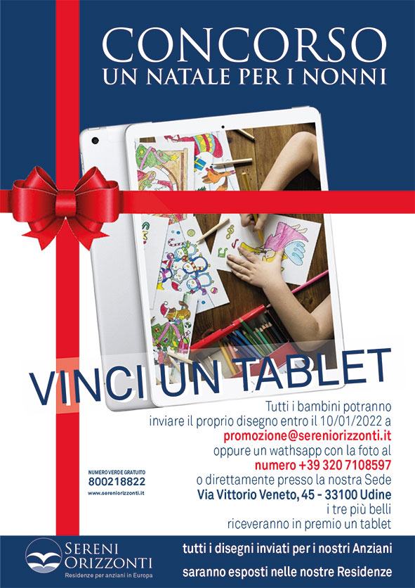 Il concorso si chiama “Un Natale per i nonni” e mette in palio 3 tablet, che verranno assegnati ai vincitori decretati da una giuria formata da ospiti delle residenze. I disegni possono essere inviati all’indirizzo [email protected], via WhatsApp al numero +39 320 710859 oppure direttamente nella sede del gruppo a Udine, in Via Vittorio Veneto 45. «Sarà l’occasione – spiega Laura Canton, responsabile dell’iniziativa – per fare sentire ai nostri nonni il calore dei giovanissimi, trasmettendo loro il senso di appartenenza a una comunità che non li ha mai dimenticati».