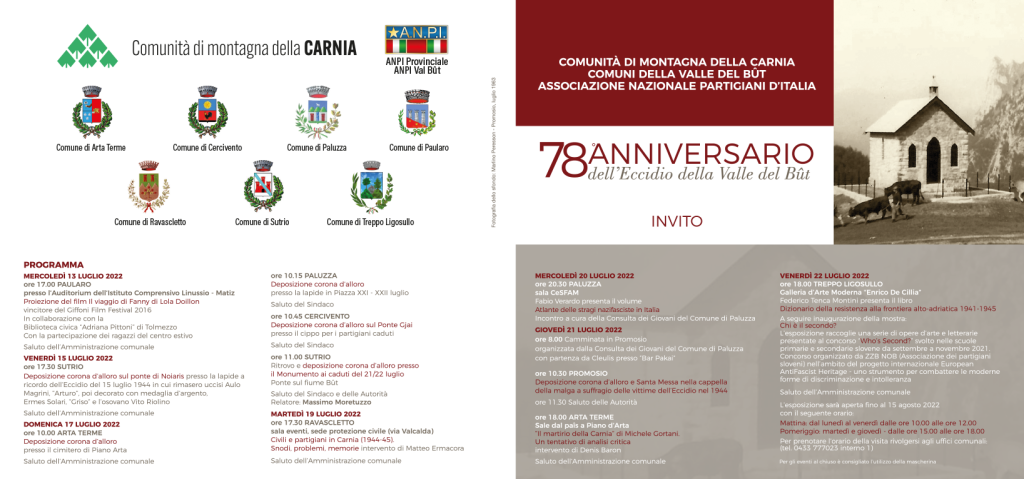 TOLMEZZO, 11/07/2022 – La Comunità di montagna della Carnia, i Comuni della Valle del Bût, il Comune di Paularo e l’Associazione Nazionale Partigiani d’Italia (A.N.P.I.) Comitato Provinciale e della Val Bût organizzano una serie di manifestazioni storico-culturali per celebrare il 78° anniversario dell’Eccidio della Valle del Bût, in memoria dei tragici fatti accaduti nel luglio del 1944, che hanno visto la violenza delle truppe di occupazione nazifasciste costare la vita a decine di persone tra anziani, giovani, donne e bambini.