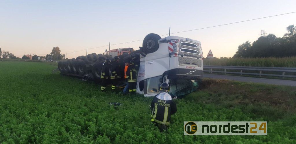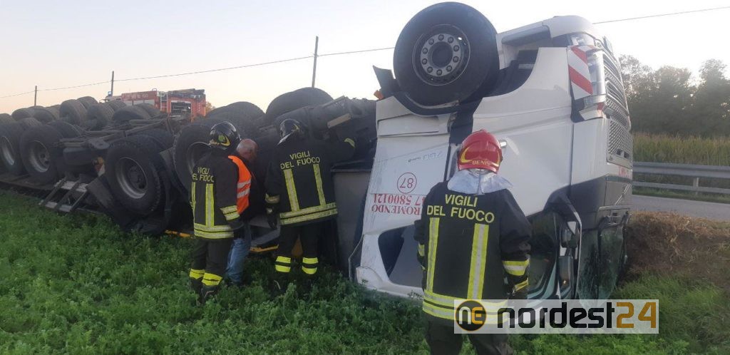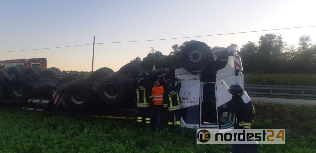 Varmo. Cede il ciglio stradale ed il camion si ribalta: autista incastrato
