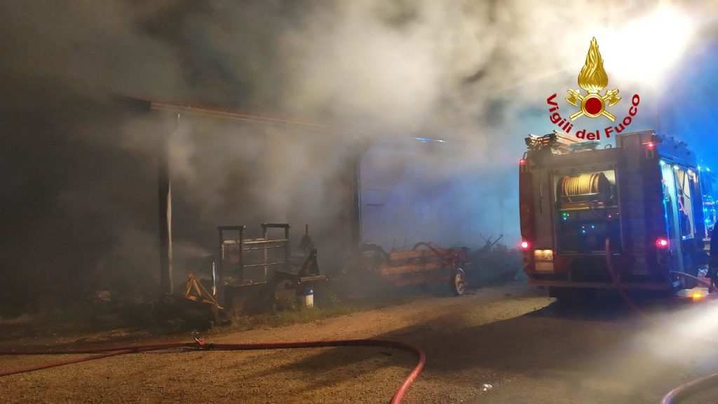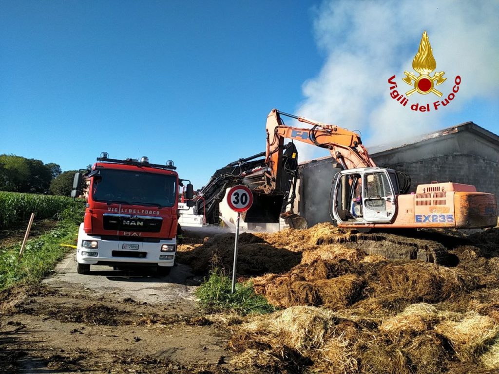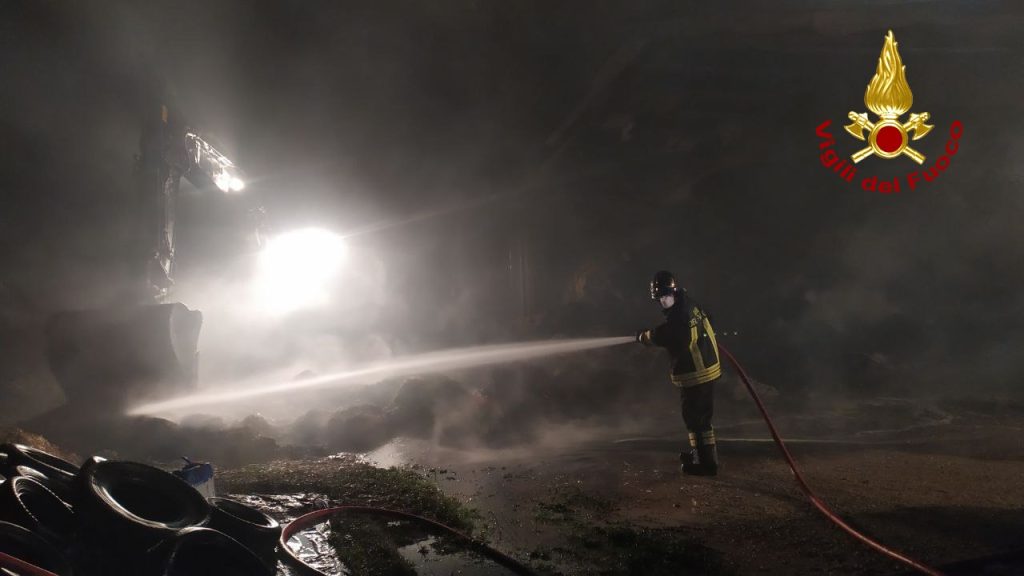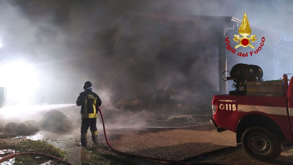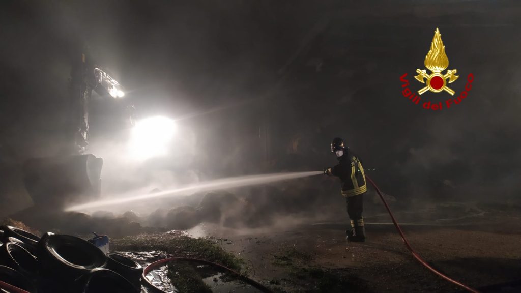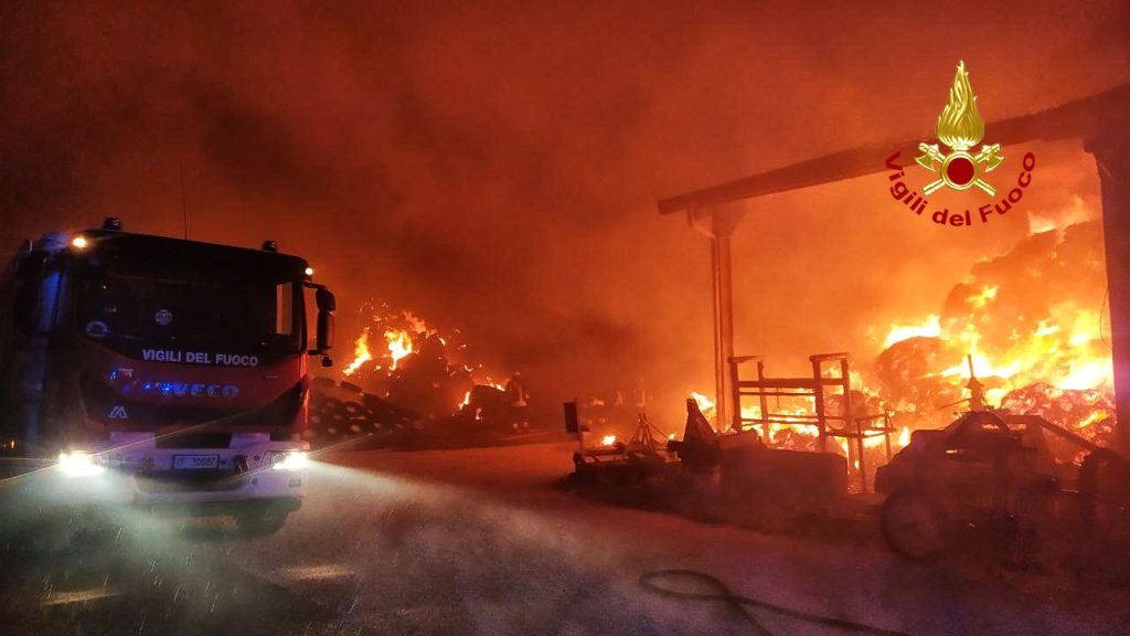Le fiamme ora circoscritte hanno bruciato un capannone con all’interno un trattore, un carro miscelatore, diversi rimorchi e altra attrezzature varie, un deposito di rotoballe all’aperto e uno sotto i portici, per un totale di oltre 1600 quintali di foraggio.