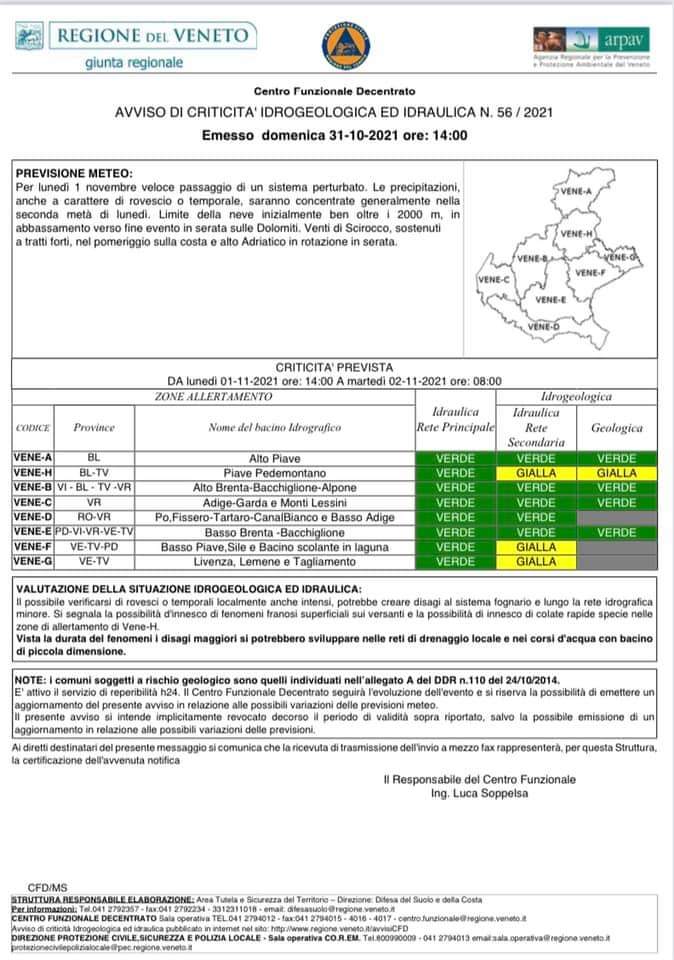 VENETO. Una perturbazione in avvicinamento ha indotto il Centro Funzionale Decentrato della Protezione Civile della Regione Veneto a dichiarare lo Stato di Attenzione (allerta gialla) per Criticità Idrogeologica su alcuni bacini del territorio a partire dalle ore 14 di domani, lunedì 1 novembre, e fino alle 8 di martedì 2.
